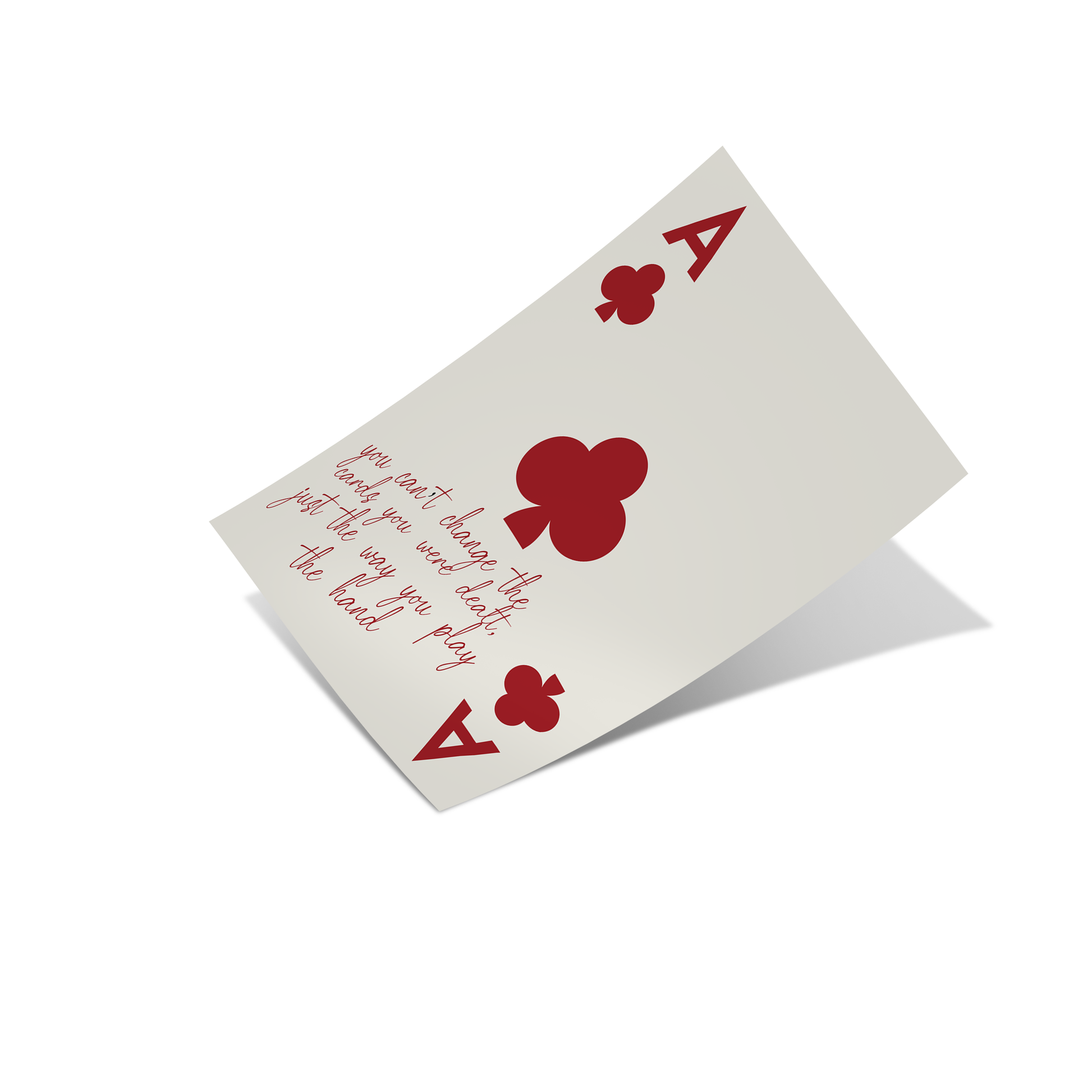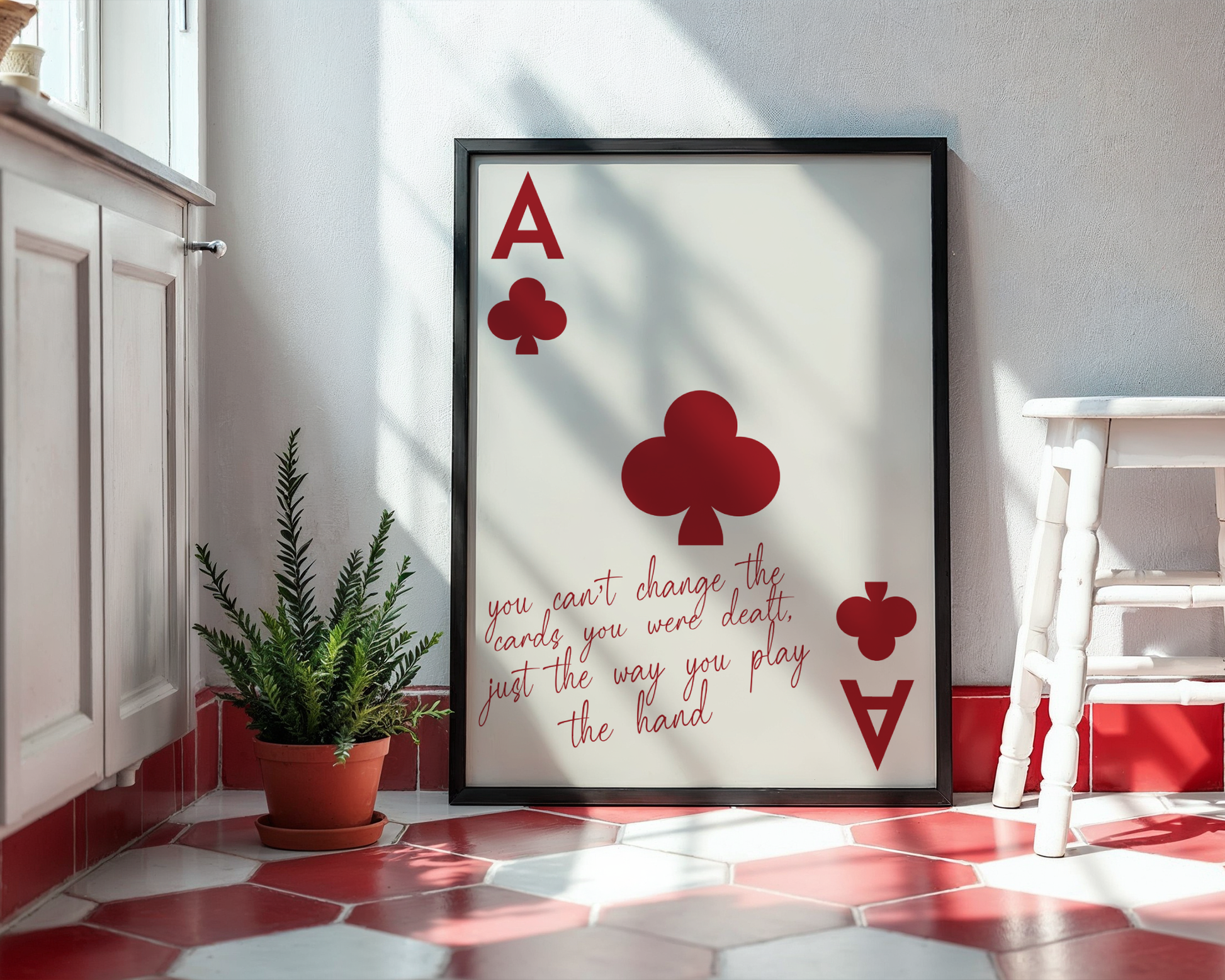 This minimalist wall art features the iconic Ace of Clubs paired with a powerful motivational quote: “You can’t change the cards you were dealt, just the way you play the hand.” Clean typography, balanced composition, and a neutral palette make this piece both timeless and versatile.