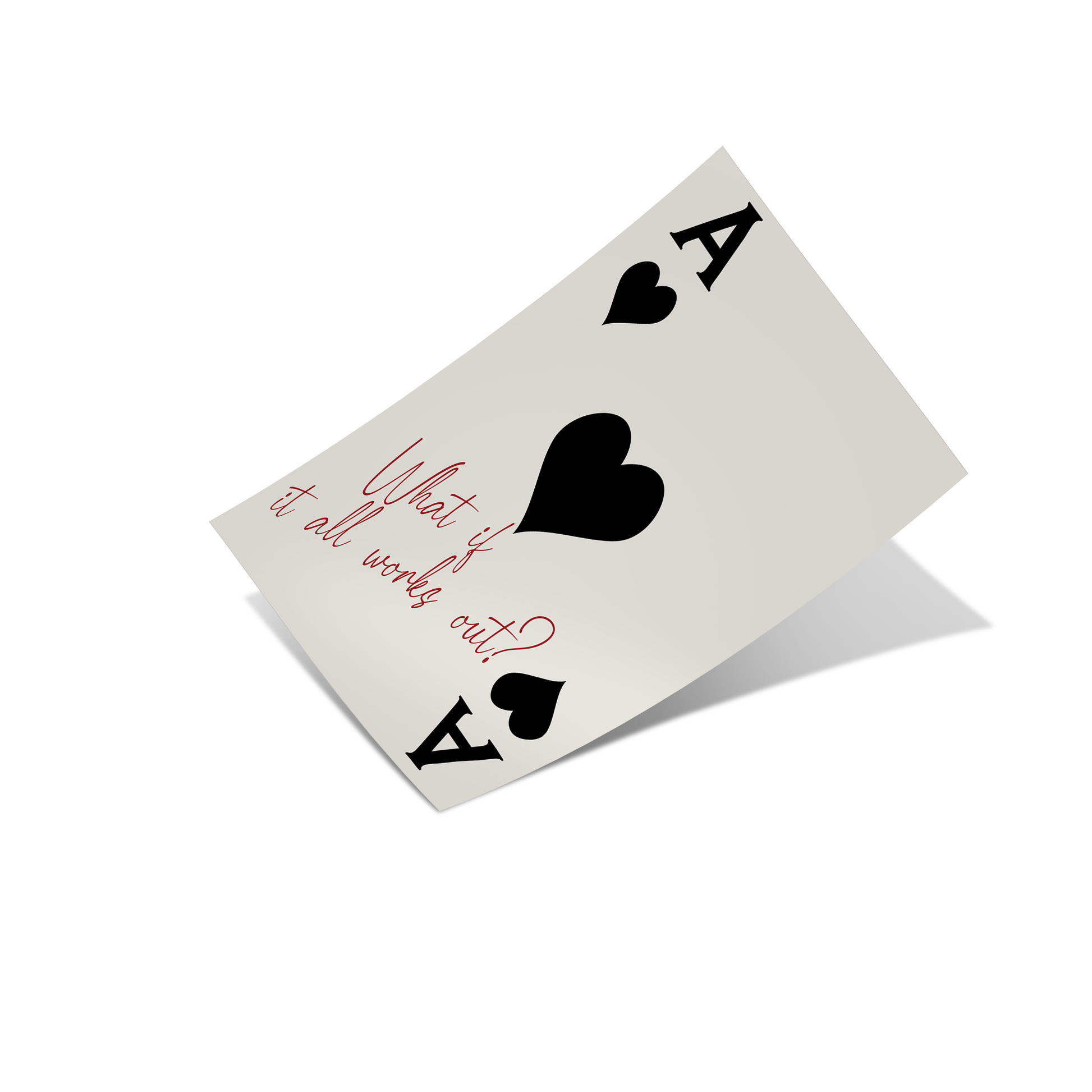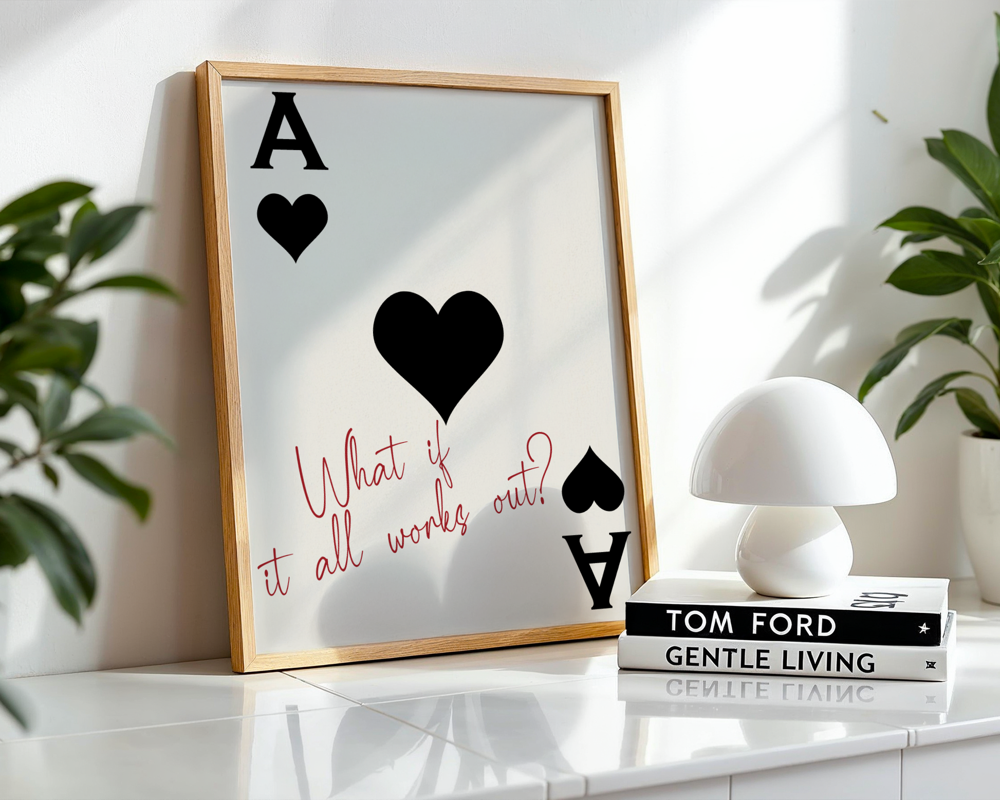 This minimalist Ace of Hearts wall art pairs a classic playing card symbol with an uplifting, forward-looking quote: “What if it all works out?” Designed with clean lines, soft neutral tones, and elegant typography, this piece brings a sense of optimism and calm confidence to any space.