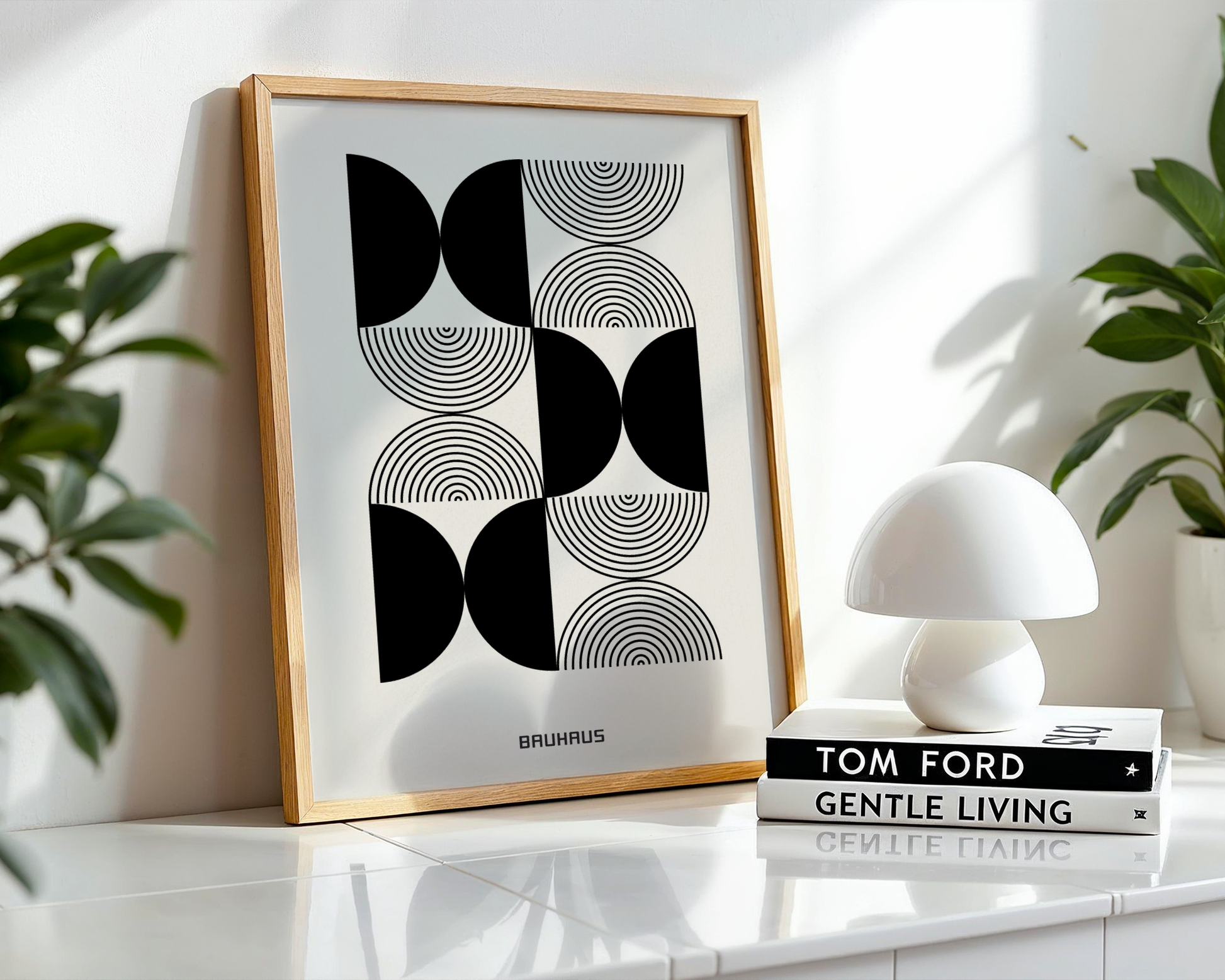 A refined tribute to early modernist design, this Bauhaus 1923 Poster captures the essence of geometric balance and functional beauty. Featuring bold black forms contrasted with delicate concentric line patterns, the composition reflects the timeless principles that defined the Bauhaus movement.