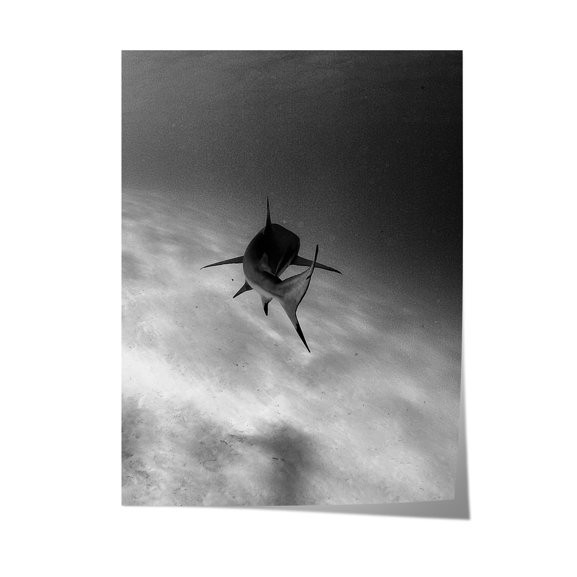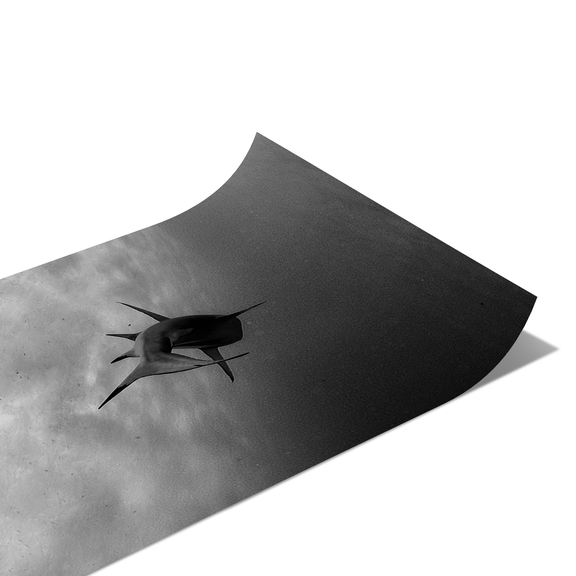 This striking black-and-white wall art captures a shark in a moment of pure motion, suspended beneath the surface with quiet power and precision. Shot from above, the minimalist composition emphasizes form, movement, and contrast, creating a dramatic yet refined visual impact.