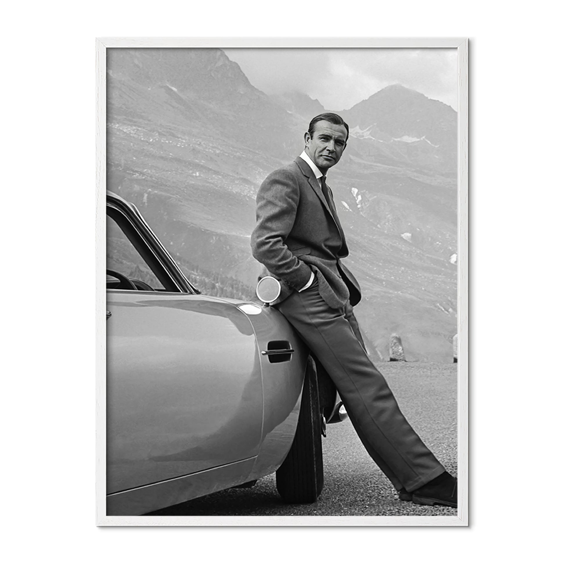 Timeless elegance meets cinematic atmosphere in this striking black and white wall art. Featuring a sharply dressed gentleman leaning against a classic sports car set against a dramatic mountain backdrop, this artwork captures the essence of confidence, refinement, and effortless style.