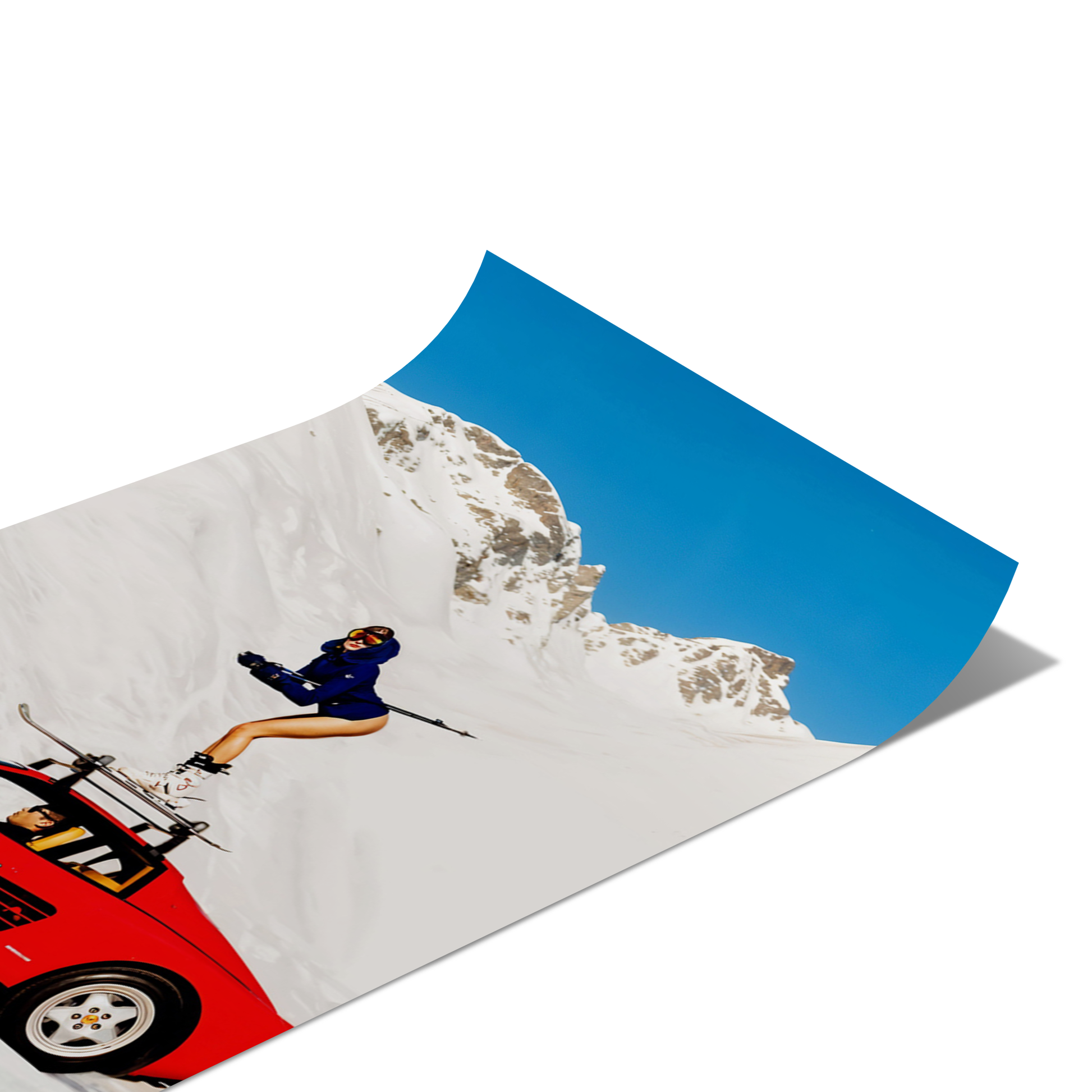 Bold, playful, and unmistakably iconic, this striking art print captures a surreal alpine moment where luxury motoring meets high-altitude adventure. Featuring a classic red Ferrari set against snow-covered mountains, with a skier poised dramatically above, this artwork blends retro glamour with contemporary humour.
