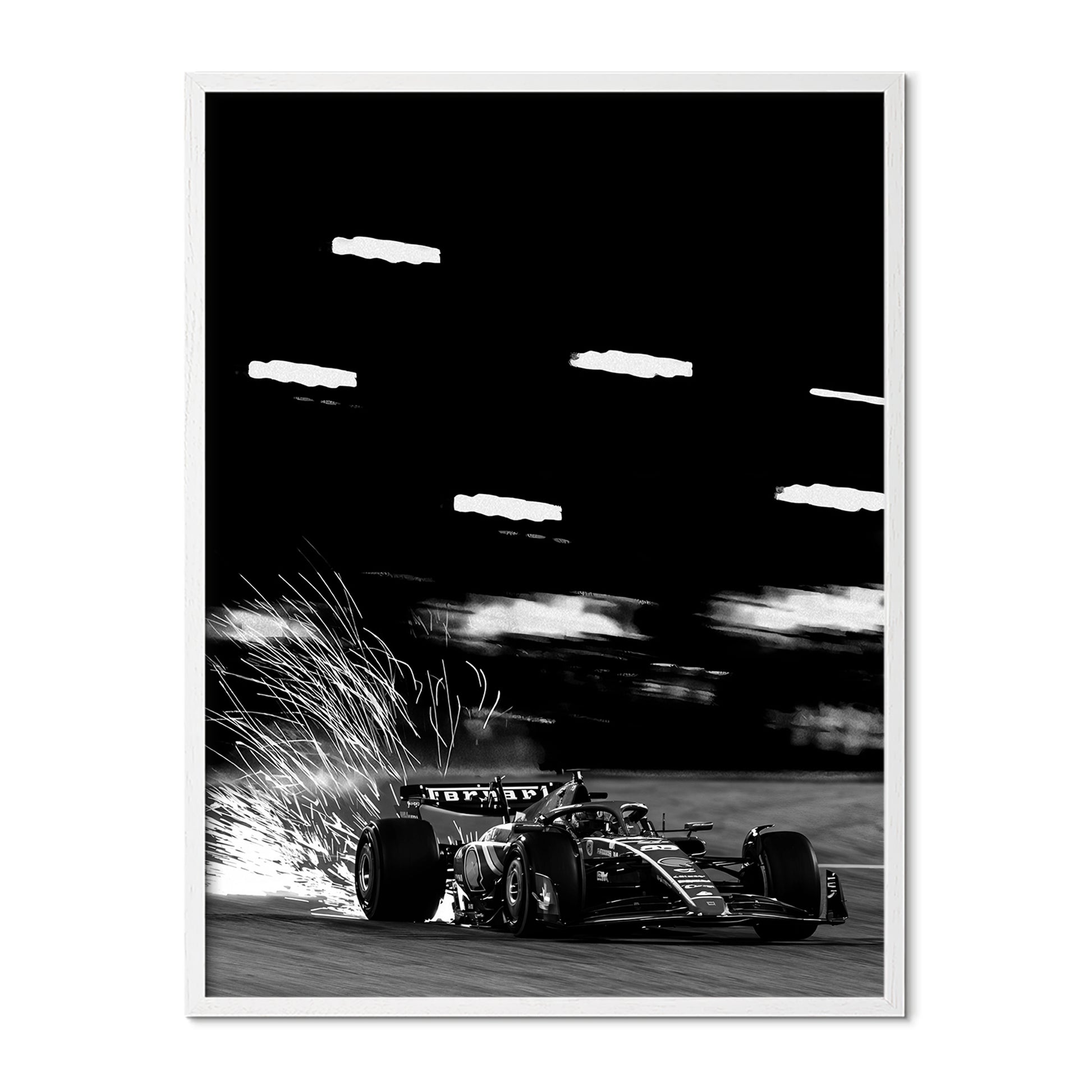 Raw speed meets controlled chaos in this dramatic monochrome motorsport print. Captured under floodlights, the racing car slices through the circuit as sparks explode from beneath the chassis, freezing a split second where precision, power, and risk collide.