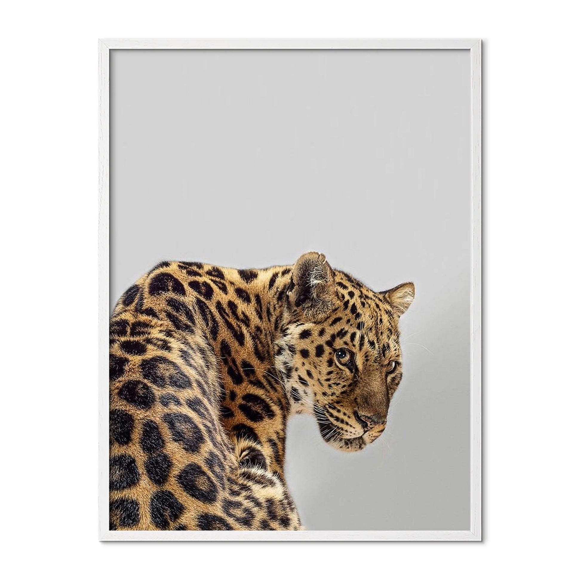 A striking portrait of raw elegance and quiet power, capturing the intense gaze of a leopard against a clean, neutral backdrop. The minimalist composition highlights the animal’s natural markings, strength, and poised movement, creating a refined balance between wild nature and modern design.