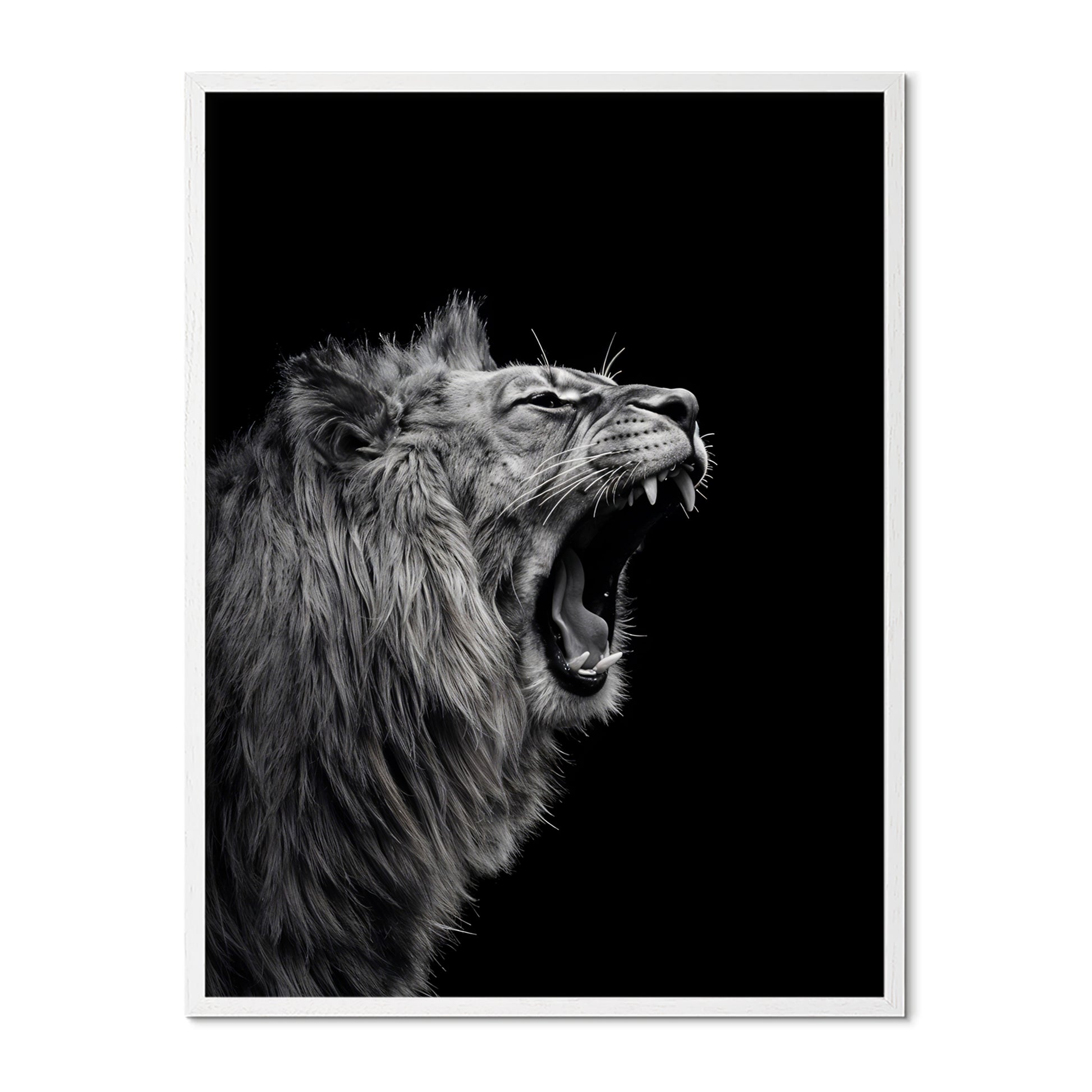 A powerful monochrome portrait capturing a lion mid-roar, frozen in a moment of raw dominance and intensity. Set against a deep black background, the image emphasises texture, movement, and strength, allowing every detail of the mane and expression to command attention.
