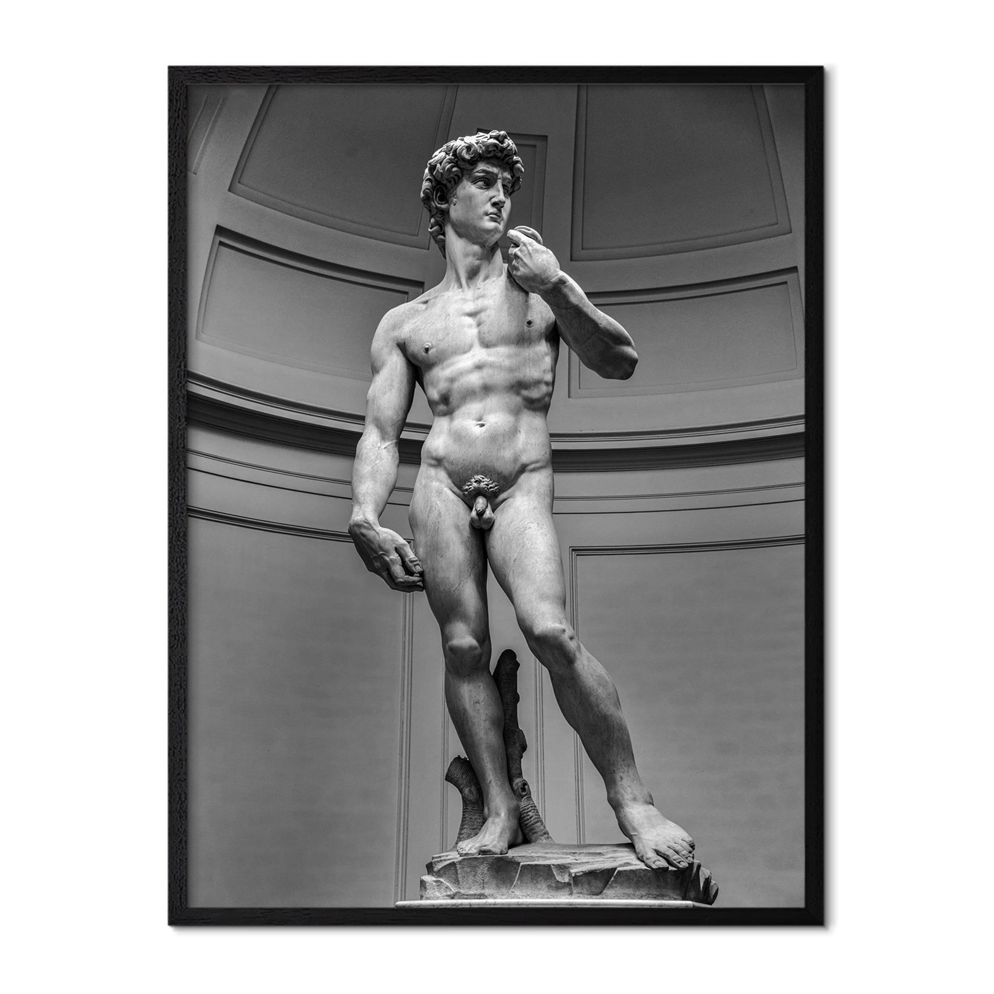A striking black and white interpretation of Michelangelo’s David, capturing the timeless perfection, strength, and balance of Renaissance sculpture. The monochrome treatment highlights every contour and detail, bringing focus to the sculpture’s form, proportion, and quiet power.