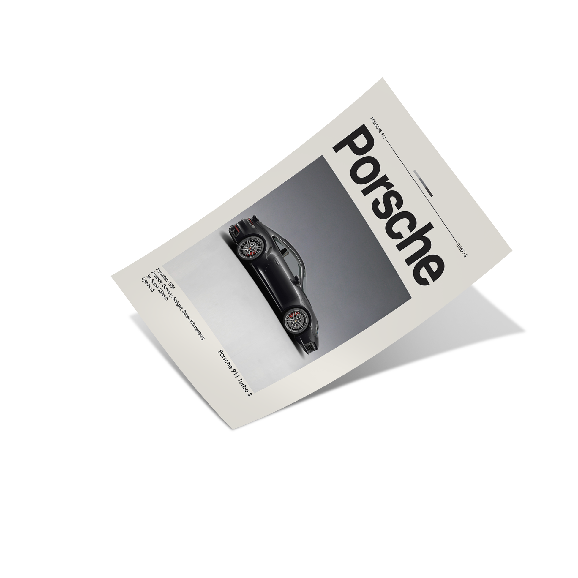 This minimalist Porsche poster showcases the iconic Porsche 911 Turbo S in a clean, editorial-style layout inspired by classic automotive design magazines. The side-profile composition highlights the timeless silhouette, precision engineering, and unmistakable presence of Porsche’s flagship performance car.