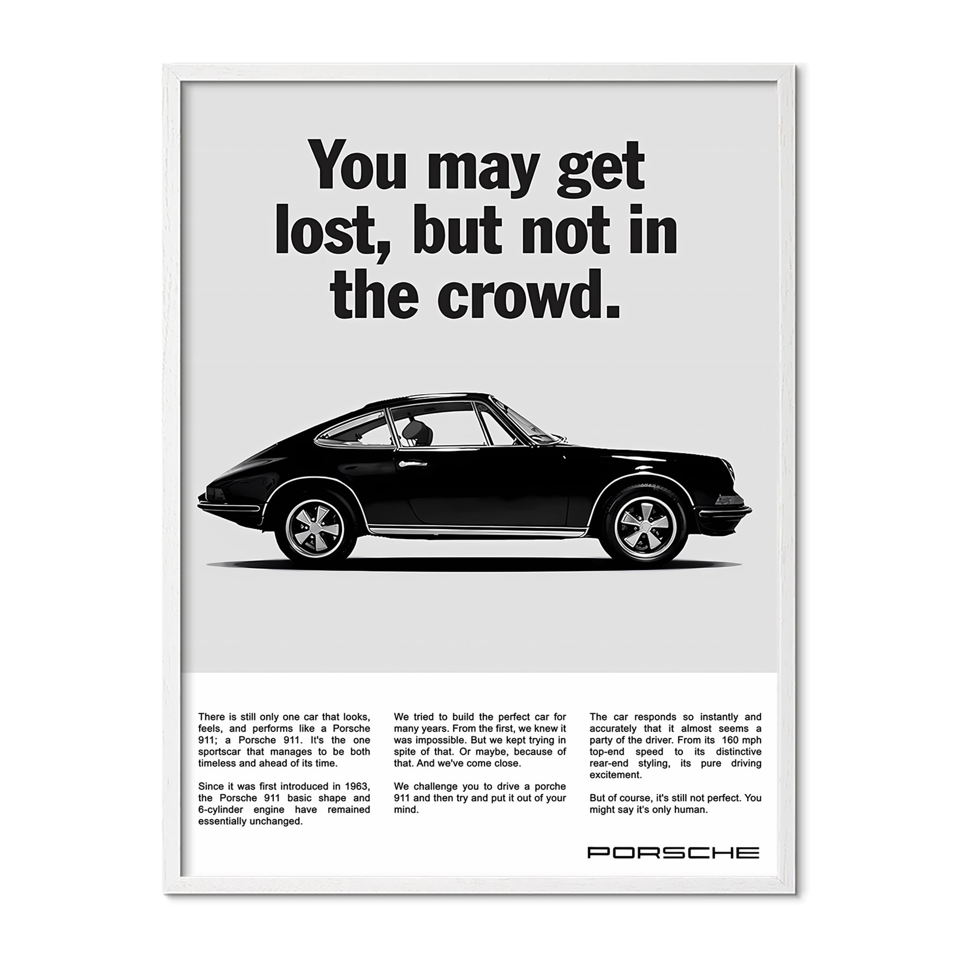 This vintage-inspired Porsche poster captures the timeless spirit of the iconic Porsche 911 through classic advertising design. Featuring the unmistakable silhouette of the early 911 paired with bold typographic messaging, the artwork reflects Porsche’s philosophy of individuality, performance, and enduring character.
