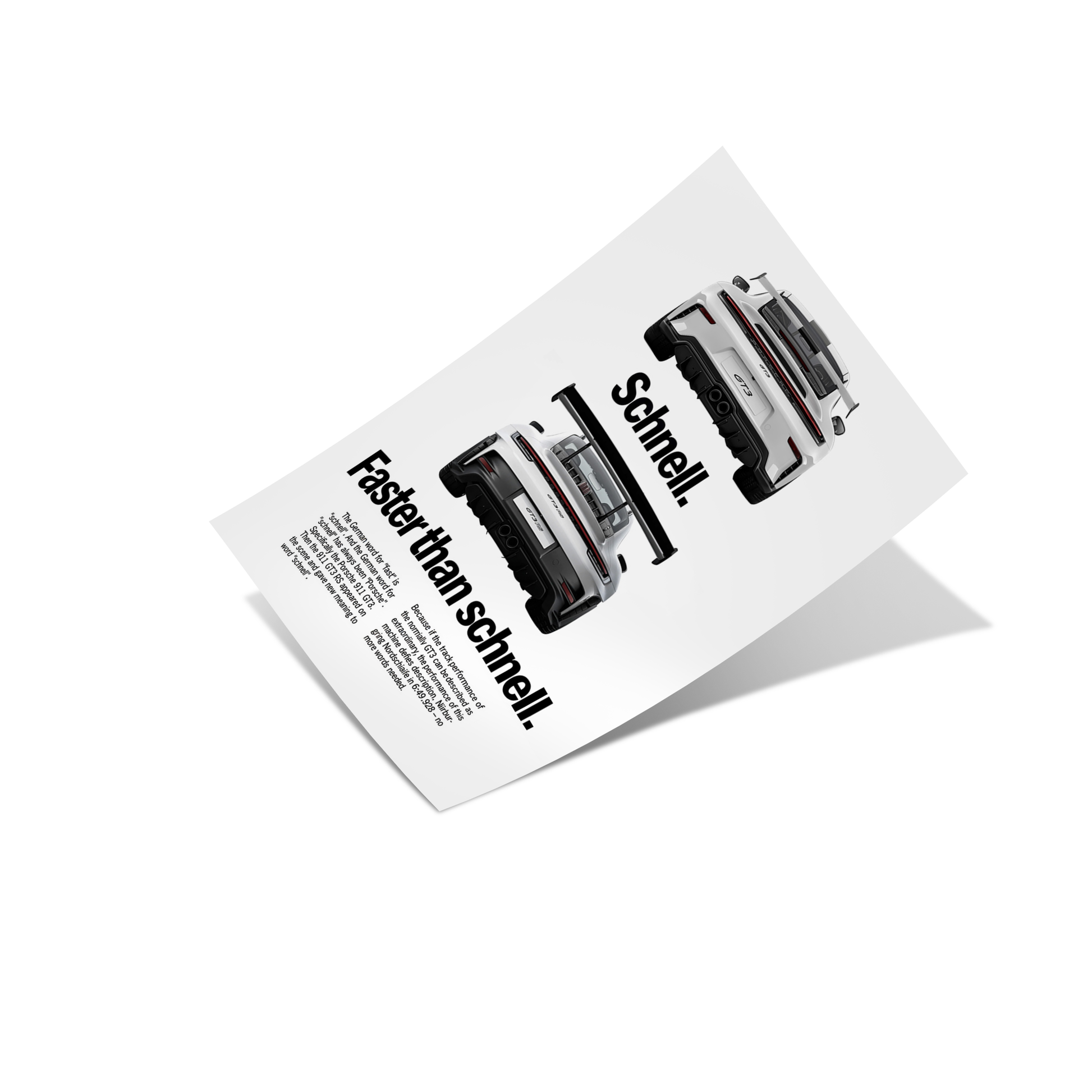 This minimalist automotive poster celebrates Porsche’s relentless pursuit of speed and precision. Featuring rear views of a Porsche 911 GT3 and GT3 RS, the composition highlights the evolution of performance through clean lines and bold typography.