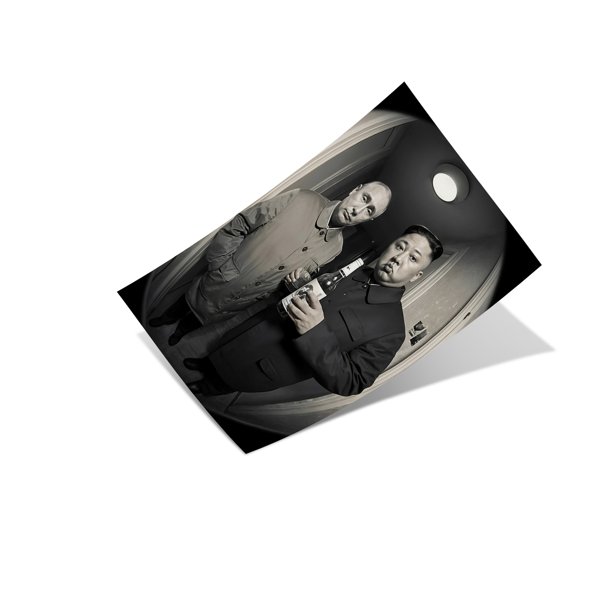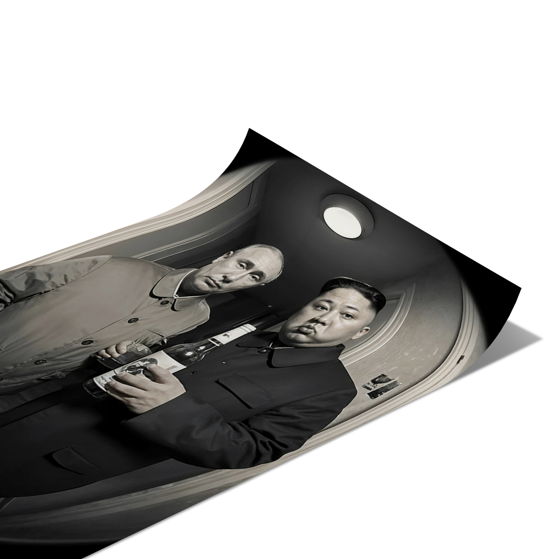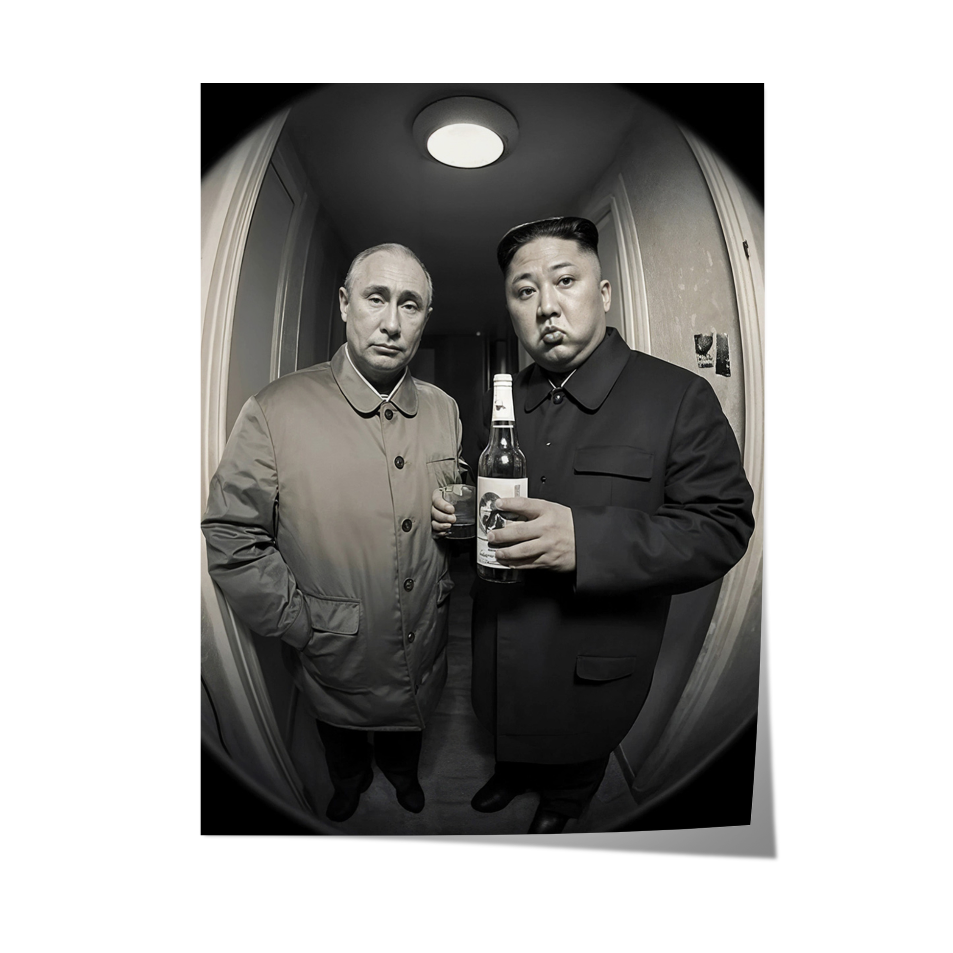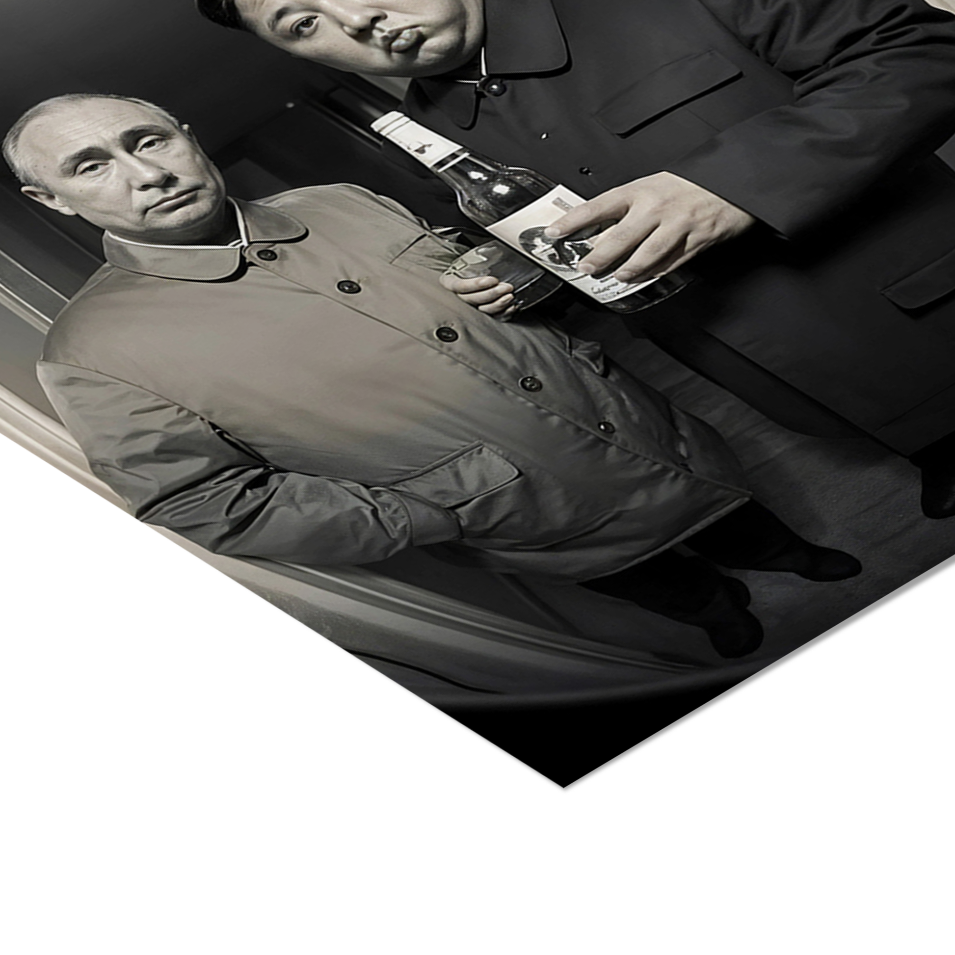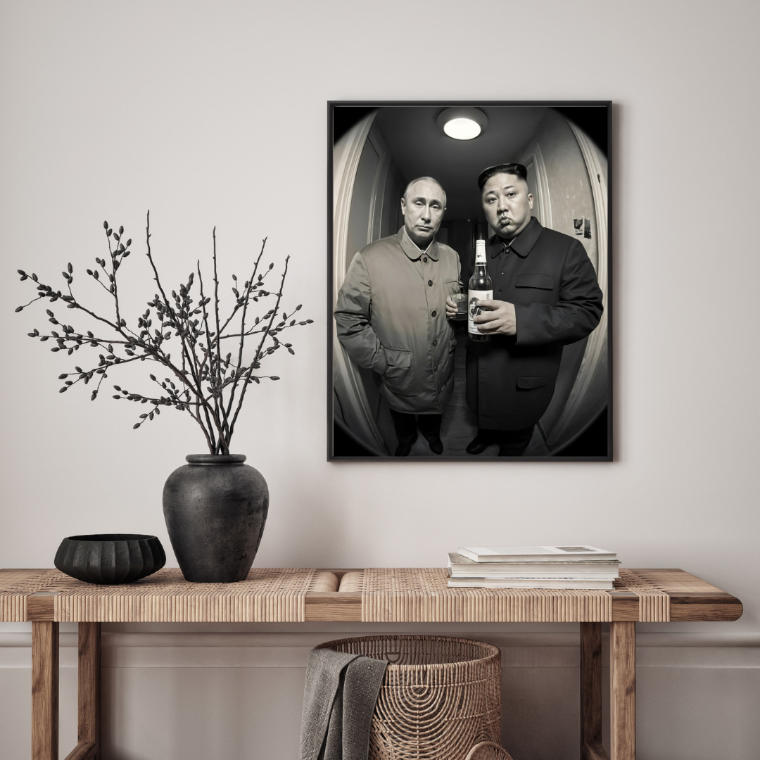 This provocative monochrome artwork captures a surreal moment of authority, excess, and quiet tension. Two figures stand in a confined interior space, their expressions and posture creating a striking contrast between formality and absurdity.