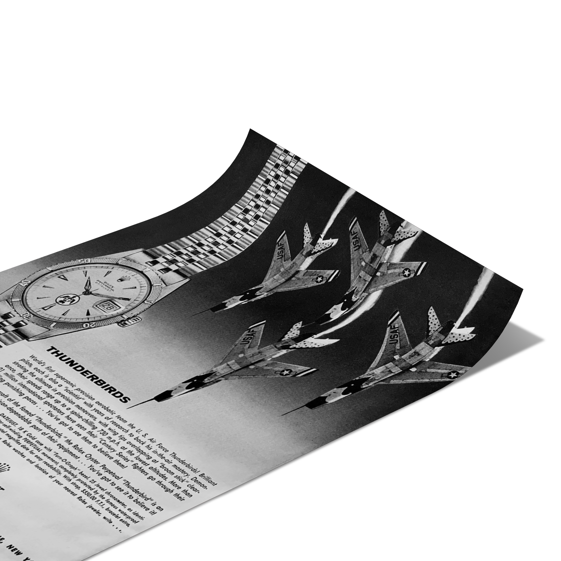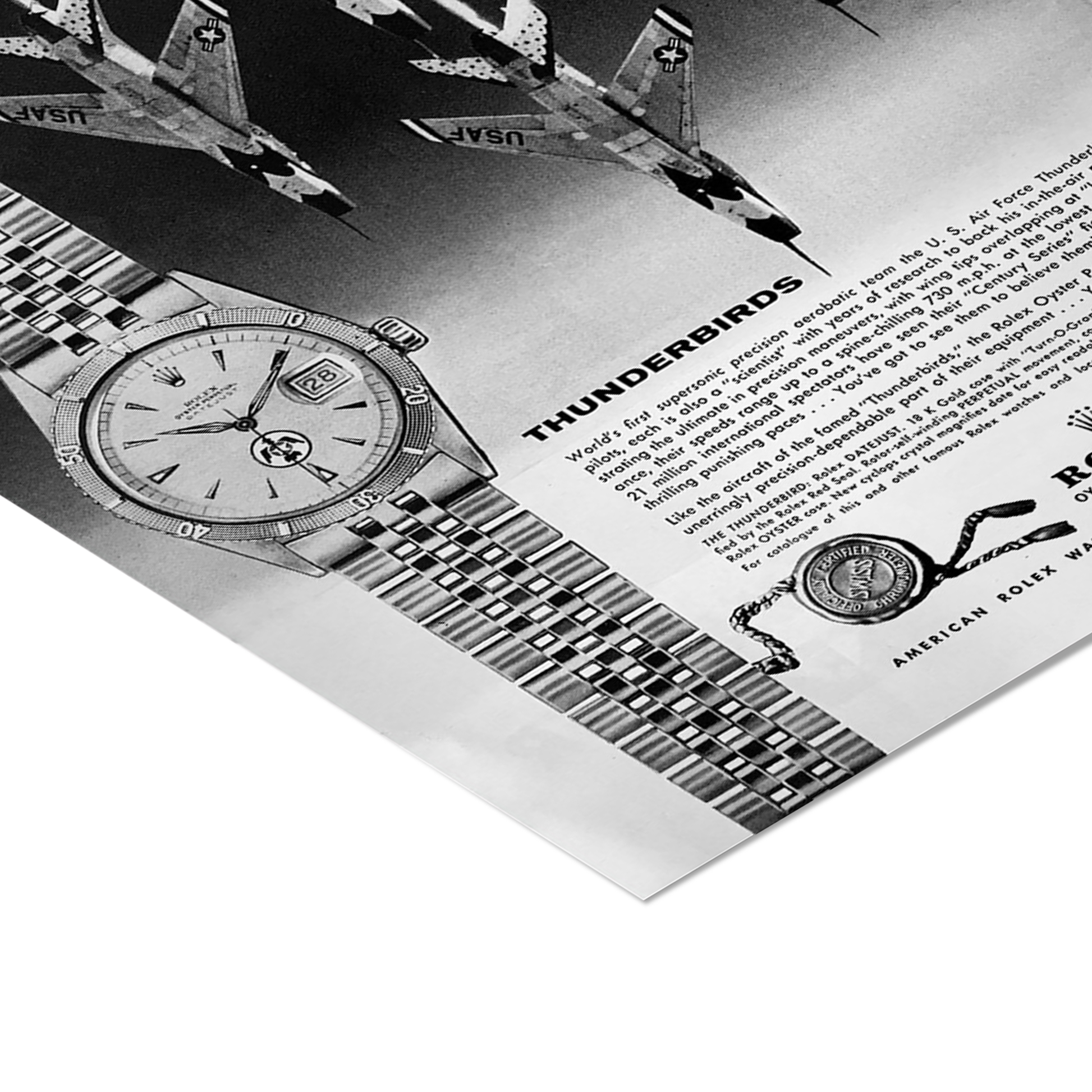A striking reproduction of a classic Rolex advertisement featuring the Oyster Perpetual alongside the iconic U.S. Air Force Thunderbirds. This vintage composition blends precision engineering with aviation excellence, capturing a timeless era of ambition, discipline, and performance.