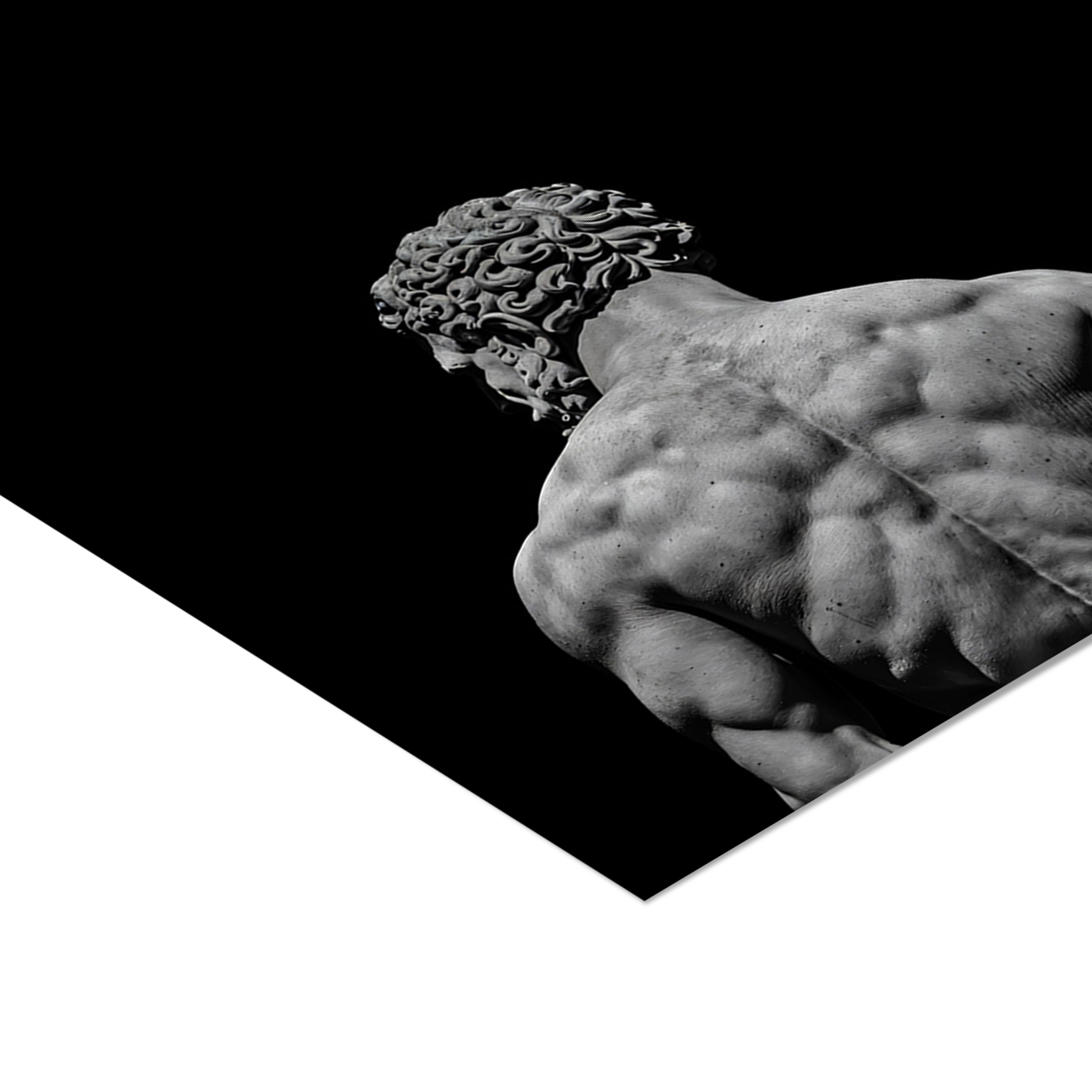 A powerful black and white study of the classical Farnese Hercules Statue, captured from the back to emphasise strength, proportion, and timeless masculine form. The dramatic contrast and deep shadows highlight the sculpted musculature, evoking discipline, resilience, and ancient ideals of perfection.